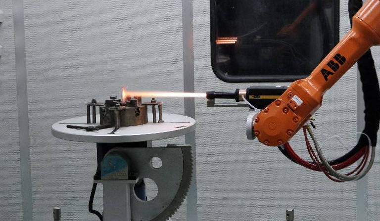 热喷涂设备为Oerlikon Metco F4-MB等离子喷涂,采用快速送粉,氩气和氢气作为等离子气体。 等离子枪和干冰喷嘴都与机器人相连,并喷洒在附着在旋转滚筒上的样品上。 等离子枪和喷嘴对齐,使等离子枪和喷嘴都垂直于样品筒。 等离子喷涂体羽流中心线与喷嘴出口的垂直距离为25mm,喷嘴距离基板25mm